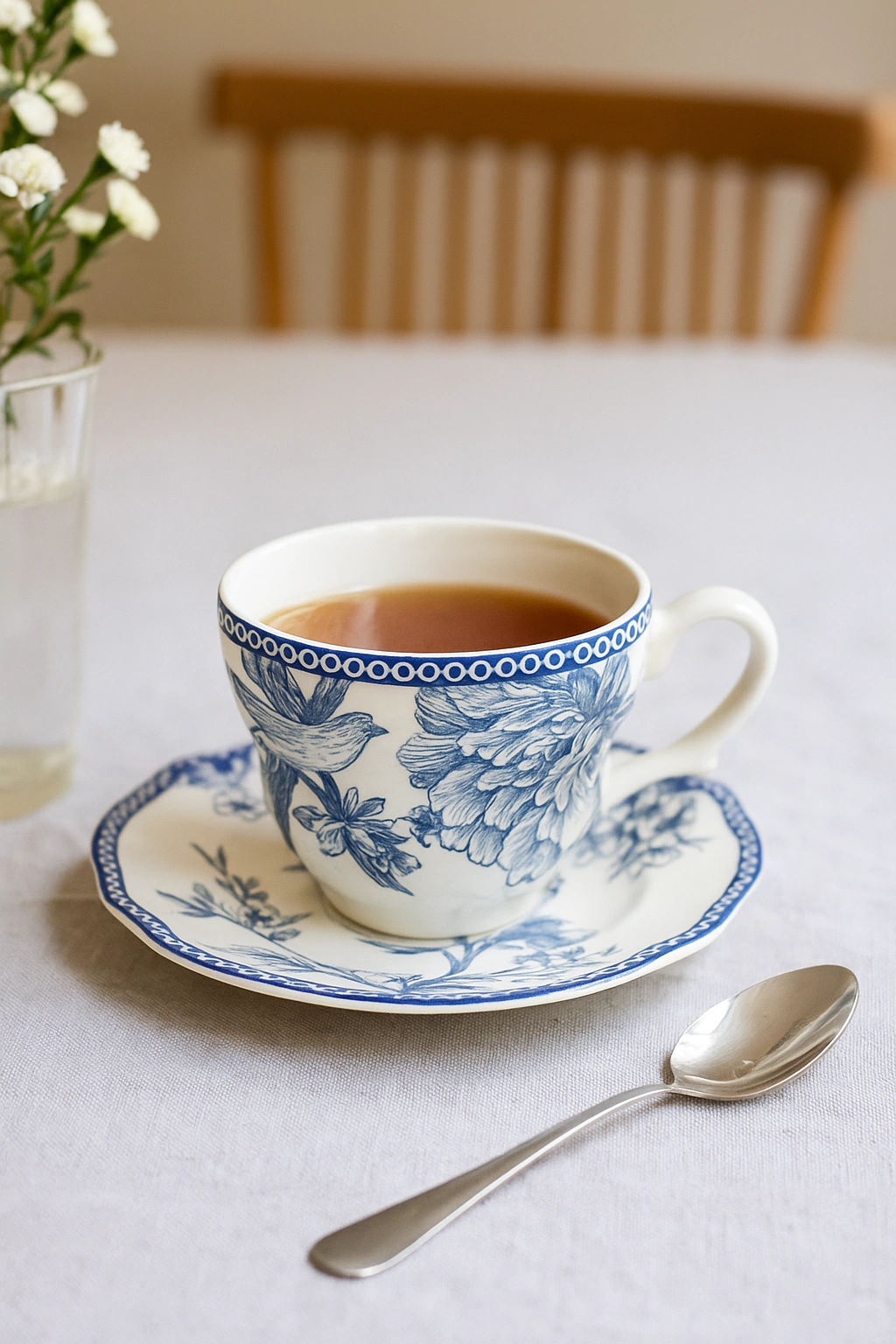 Taza de té de cerámica con plato a juego, decorada con delicadas ilustraciones en azul. Su diseño clásico aporta distinción a tus momentos de té o café. Capacidad aproximada: 220 ml. Apta para lavavajillas y microondas.